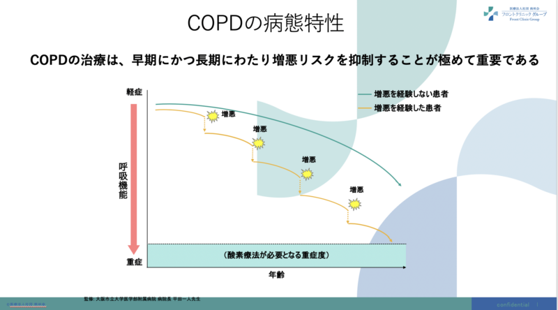 ではなぜ、COPDは早期診断・早期治療を行わなければならないのでしょうか?それはCOPDという病気は、喘息と同様に進行性の病気であり、適切な治療を行わないと呼吸機能が加速度的に下がり、将来、酸素を使用しながらの生活になってしまったりするからです。COPDの増悪(発作)を薬を使って適切にマネージメントしないとどんどん呼吸機能が下がっていくのが下の図を見ていただければご理解いただけると思います。