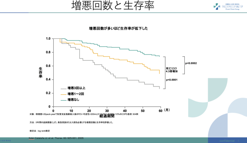 また、増悪回数が多いと長期的に生存率が下がることも報告されています。
